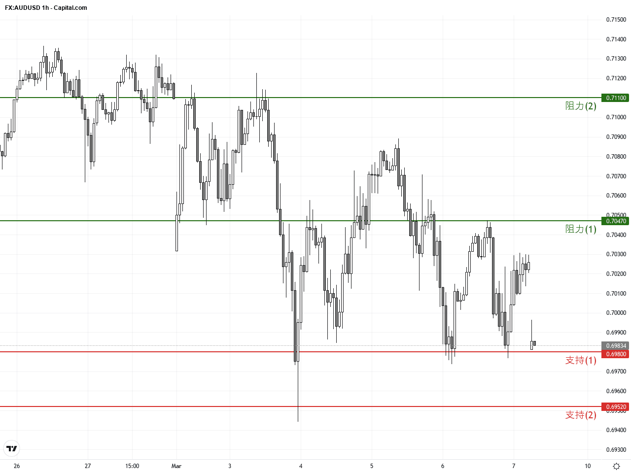 技術面上,20日移動平均線提供強有力的支撐,若價格持續站穩此區,多頭反攻將有機會延續。MACD的多頭趨勢和價格的穩定守住整數關口均為積極信號。近期形成的微型反轉形態暗示接近短線底部,投資者可密切關注上破0.7110阻力的動作以確認後市方向。今日無重大與AUDUSD直接相關的經濟事件,預計市場波動主要受全球地緣政治與美國經濟數據前瞻影響,短期內缺乏足夠的基本面驅動力量來引爆劇烈價格波動,交易者可留意其他宏觀因素推動。