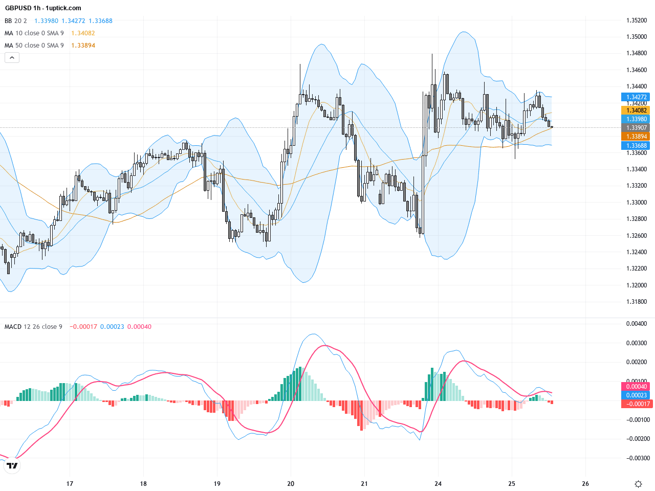 小時圖顯示過去3至5天內價格在1.3350至1.3437間震盪,布林帶擴張與收縮交替,表明短期波動偏大。短期均線如10與20均線多次交叉,最新MACD出現死叉,RSI緩慢回落至50以下,暗示短線可能偏弱。然而近期一根看漲吞沒形態(bullish engulfing)出現,表明短線多頭有反彈機會,但需警惕1.3437阻力的壓力。
