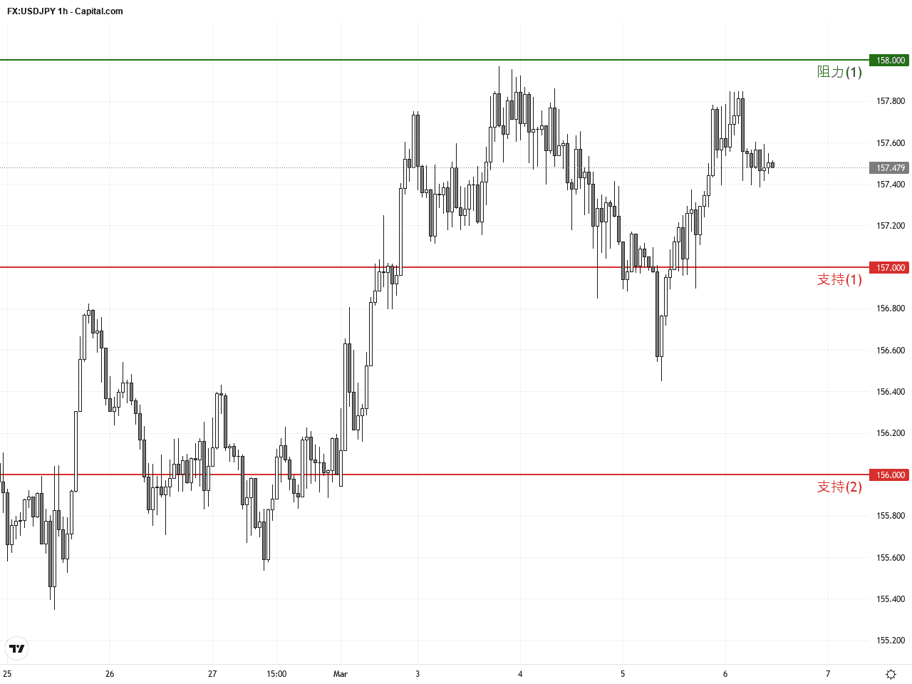 從過去3至5天的時線圖觀察,USDJPY價格在157.0至157.8間波動,短期內形成一個整固盤整的矩形區間。50小時移動平均線緊貼價格,MACD出現輕微黃金交叉,暗示短線可能出現突破。值得注意的是,近期形成的看漲吞沒K線型態,暗示未來24小時內買盤有望加強,釋放上行信號。