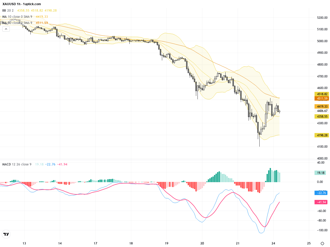 從日線圖觀察,XAUUSD從3月中旬的5000美元上方高點,快速下跌形成強烈空頭趨勢,並在3月23日最低觸及4099美元附近後反彈至4411美元。移動平均線(MA)呈現明顯下彎,短期MA(20日)和中期MA(50日)均處於高位向下傾斜,顯示日線級別仍以空頭為主。布林帶寬度擴大,意味近期波動增大;MACD指標在負區域略見拐頭,暗示跌勢可能暫時告一段落,但尚未確認底部。整體趨勢顯示空頭趨勢仍未逆轉,需要觀察是否能穩守4400美元附近支撐。