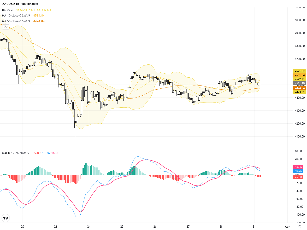 過去3至5日的時線圖中,XAUUSD價格於近期出現明顯的高低點抬高,形成上升趨勢通道。短期移動平均線(如8小時和21小時均線)多次支撐價格,顯示短線買盤積極。MACD指標呈現底背離,暗示價格可能迎來反彈機會。當前價格仍位於布林帶中軸偏上,短期阻力集中在4550美元左右。