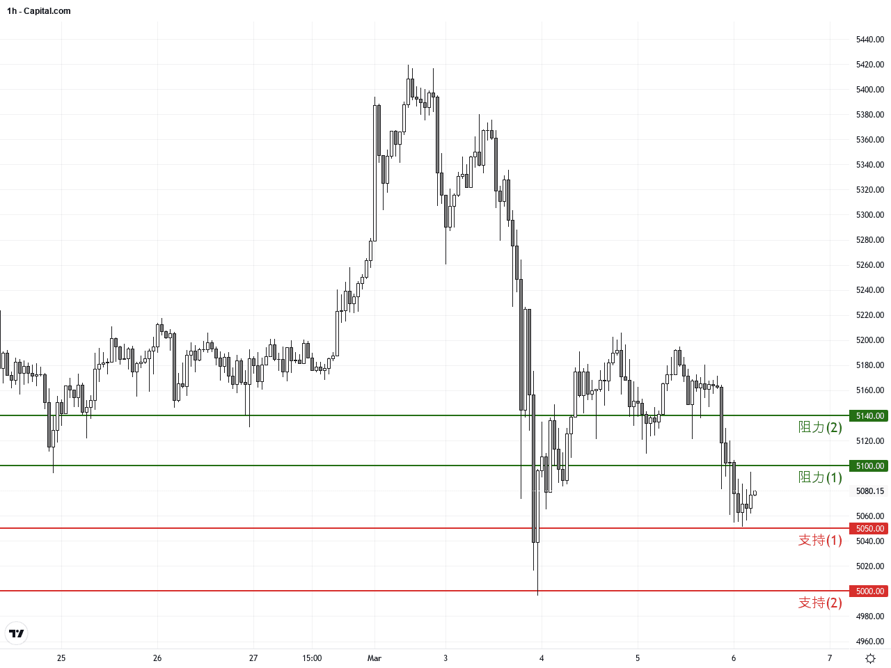 從日線圖來看,XAUUSD自2月底高點約5400美元附近下滑後,價格波動加劇,形成明顯的下挫趨勢。布林帶向下擴大,反映波動率提升,且價格多次觸及下軌,驗證賣壓強烈。短期移動平均線(例如20天均線)已由上轉下,與50天均線形成死亡交叉,顯示中長期空頭趨勢占優。MACD指標持續負吸力,暗示賣壓未見減弱。此外,價格於最近幾日多次嘗試反彈未能突破5100美元阻力,形成多個下跌反壓,屬於修正延續的技術格局。