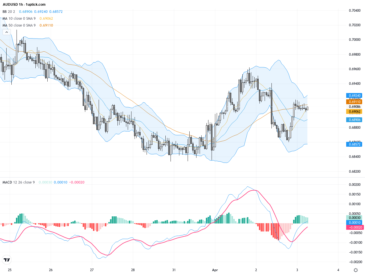 從日線圖觀察,AUDUSD由年初高點約0.718持續走弱,下行趨勢明顯。近期於0.6910一帶反覆震盪,移動平均線(50天MA約0.703,200天MA約0.671)呈收斂狀態,暗示尚未明確趨勢反轉。布林帶呈現收窄,波動率下降,意味行情或將迎來大幅波動。MACD指標顯示負柱逐漸縮小,或有反彈契機,但整體仍偏空。技術面來看,長期趨勢仍偏弱,中期有待突破0.6910阻力確認反攻。