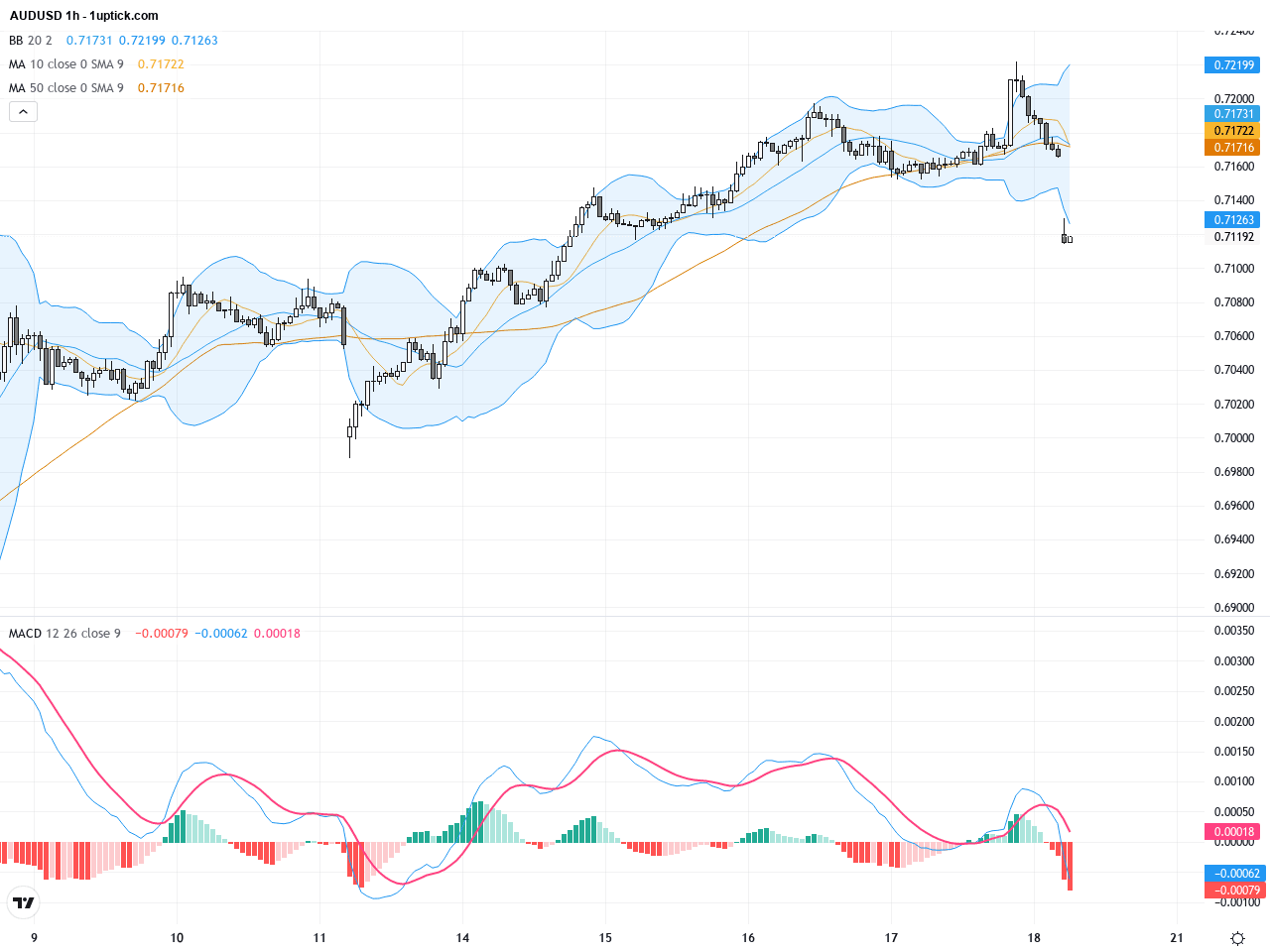 小時圖分析最近3-5日,AUDUSD價格在0.6980-0.7070區間內出現明顯技術性擠壓。近幾根k線出現早晨之星(Morning Star)型態,顯示短期有買盤回補跡象。布林帶收口狀態稍微緩解,表明震盪或突破皆有可能。MACD指標呈現快慢線即將黃金交叉的態勢,暗示短線動能或將轉強。短均線(如10期MA)穩定抬頭,帶動短線多頭動能,投資者可關注該區間突破的可能方向信號。