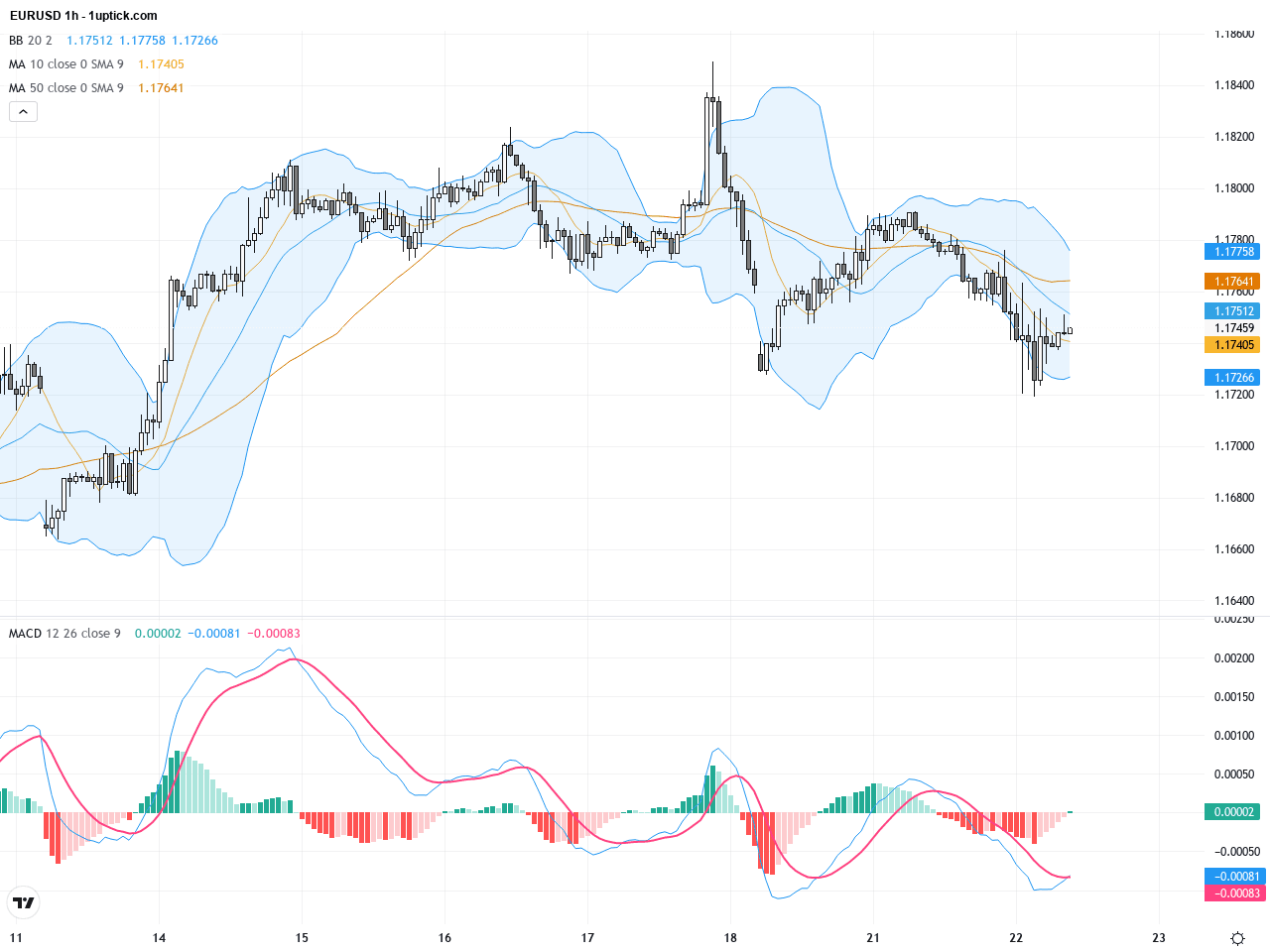 小時圖反映出近3-5日內EURUSD走勢明顯受消息面影響,價格上下震蕩頻繁,先是突破短期1.18阻力後回落至1.1740-1.1770區間內整理。短期移動平均線呈現多空爭奪態勢,布林帶收窄顯示即將迎來方向性突破。MACD快線略微下行但尚未死叉,RSI則徘徊於中性區域,短線震蕩需密切關注成交量及波動率,以掌握可能的反轉或延續信號。