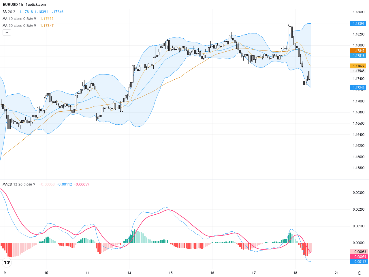 近5個交易日的時線圖展現了短線震盪與突破的過程。最近幾根K線呈現小型旗形整理,並在9:00左右出現強勢突破。短期移動平均線(5及20MA)呈現黃金交叉,價格收復布林帶中軸之上。MACD出現快慢線交叉且柱狀圖轉正,增強短期買盤信心。值得注意的是,近期在1.17750附近出現吞沒形態,暗示短期多頭將延續上行。在短線框架上,EURUSD的動能持續增強,後市調整風險降低。