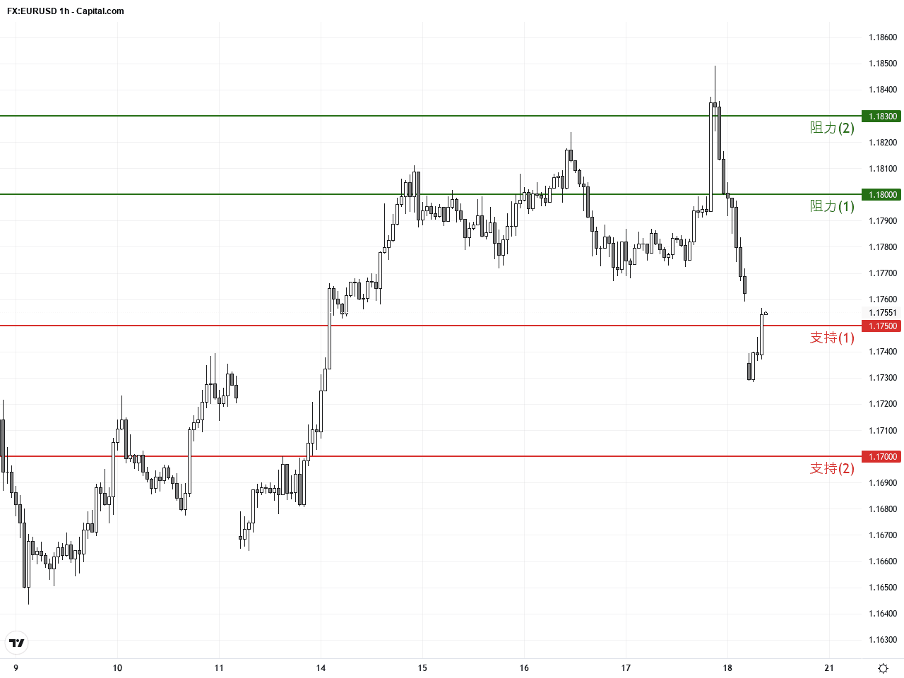 過去24至48小時內,EUR/USD表現出明顯的波動,上日收盤價為1.17545。市場在近期受到多重因素影響,其中最重要的是中東和平談判帶來的樂觀情緒,以及歐盟經濟受貿易關稅壓力拖累的背景。