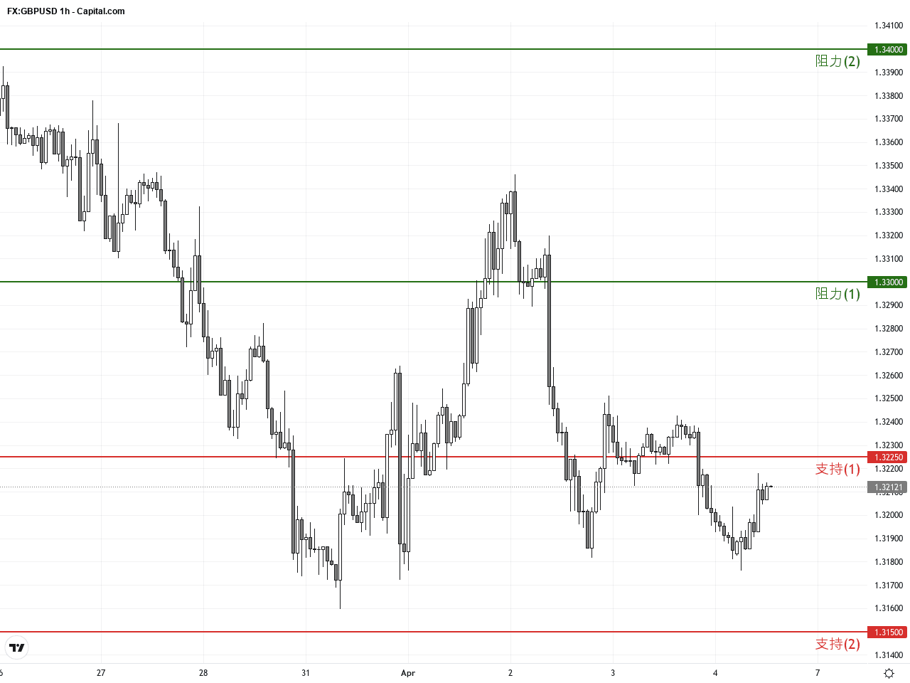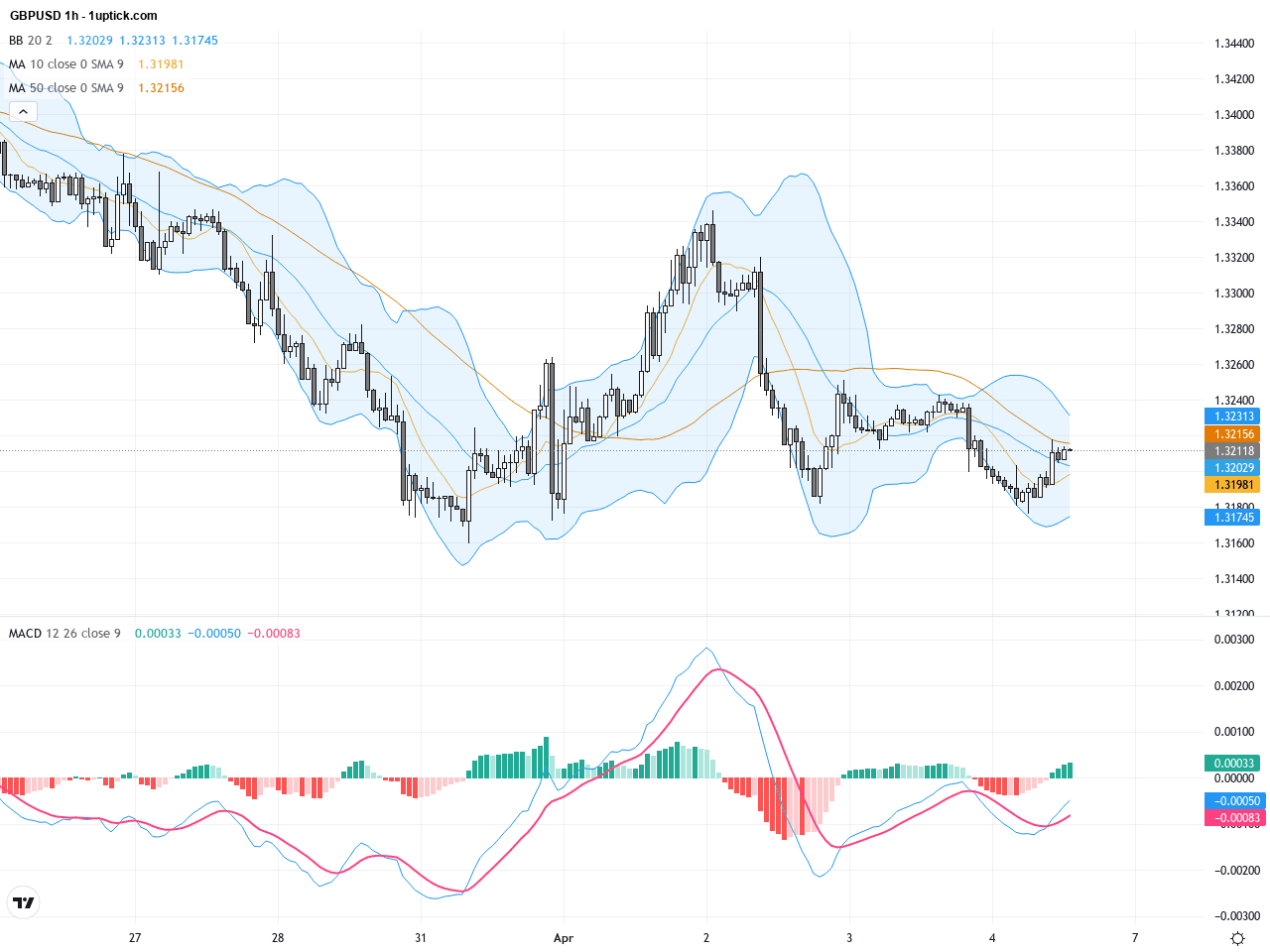 從日線圖來看,GBPUSD自年初高點1.38688開始逐步回落,目前價格位於1.3200上下整理。日線顯示多頭旗形初步形成,收斂區間中波動減少。50日與200日移動平均線均位於1.34以上,短期存在較大壓力,但價格於3月低點附近獲得支撐。MACD指標在0線附近呈現減弱且略有交叉,暗示多空能量爭奪激烈。布林帶開始收窄,預示即將迎來波動加劇階段。