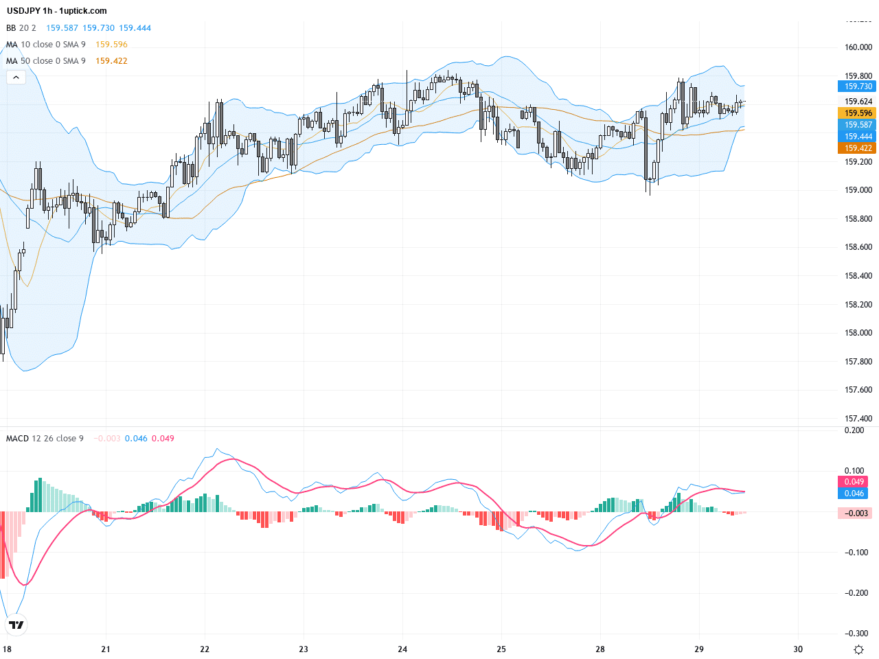日線圖顯示USDJPY處於一個穩定的多頭趨勢,自底部約156.50起逐步上升,現價159.62靠近過去幾周高點160.23。50日均線(158.27)和200日均線(153.80)持續支撐價格,彰顯中長期上升動能。布林帶顯示價格目前接近中軌,波動率有所壓縮,暗示可能將有一波較大波動。MACD指標在零軸上維持多頭排列,但趨勢動能有所放緩,顯示短線賣壓在累積。