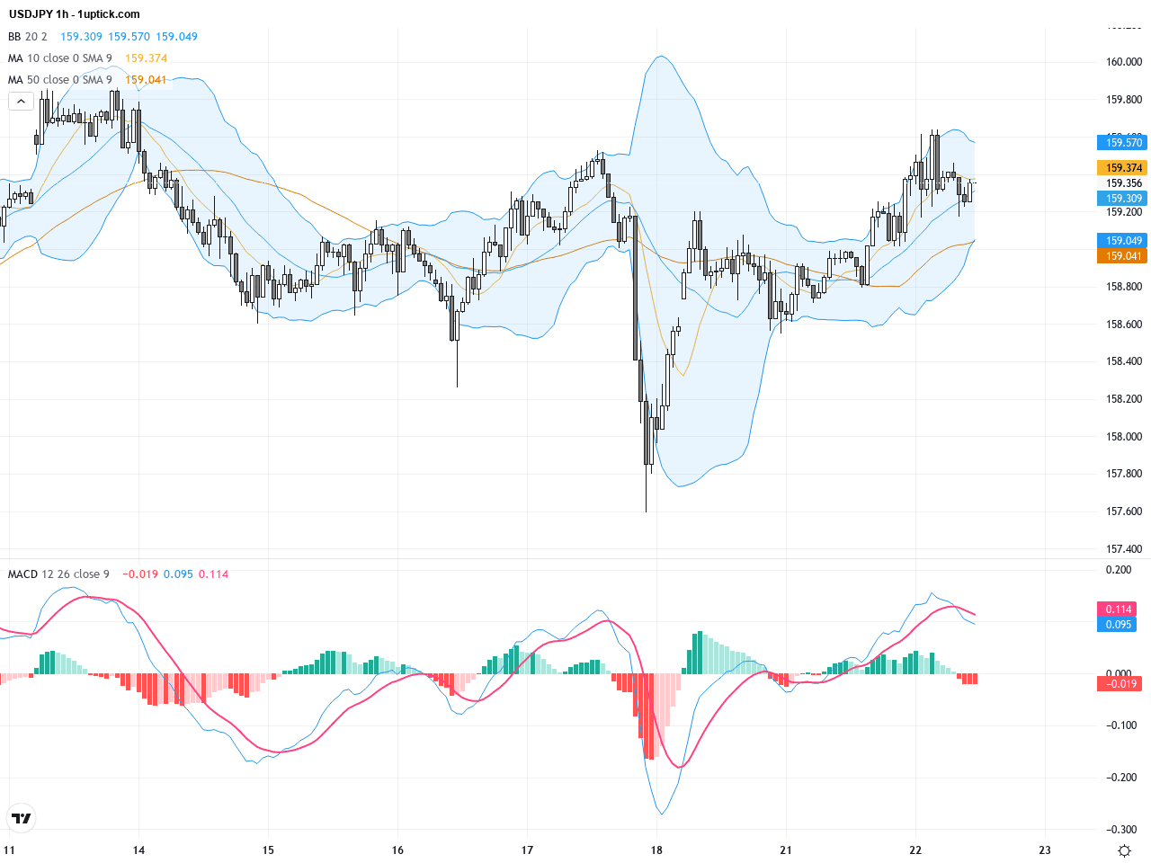 在過去3至5日的時線圖中,USDJPY表現出明顯的震盪上行趨勢。價格沿著短期均線上升,MACD快線剛剛完成黃金交叉,暗示短期動能轉強。布林帶中軸支撐有效,近期形成的看漲吞沒K線形態表明接下來24小時內將可能繼續維持多頭走勢,留意小波幅回調作為入市良機。