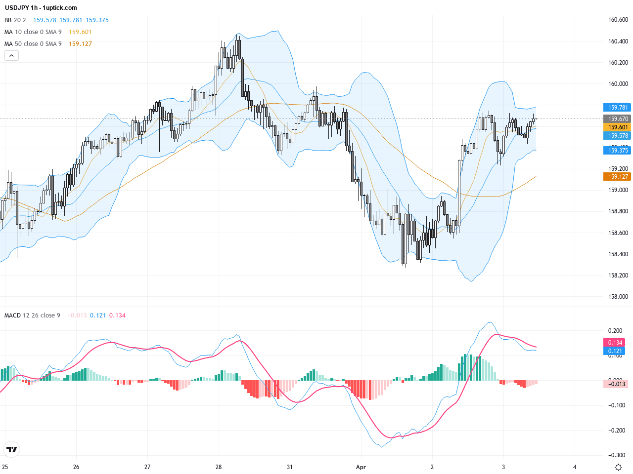 小時圖中,過去3-5日USDJPY呈現漸進式上升,價格多次測試160心理關卡但未穩住。MACD呈現持續正向柱狀圖,顯示短期動能仍強。布林帶內價格位於中上軌,短線震盪偏強。近期形成的小型旗形整理格局可能有進一步上破的潛力,但若出現反轉信號,則須警惕短期修正。