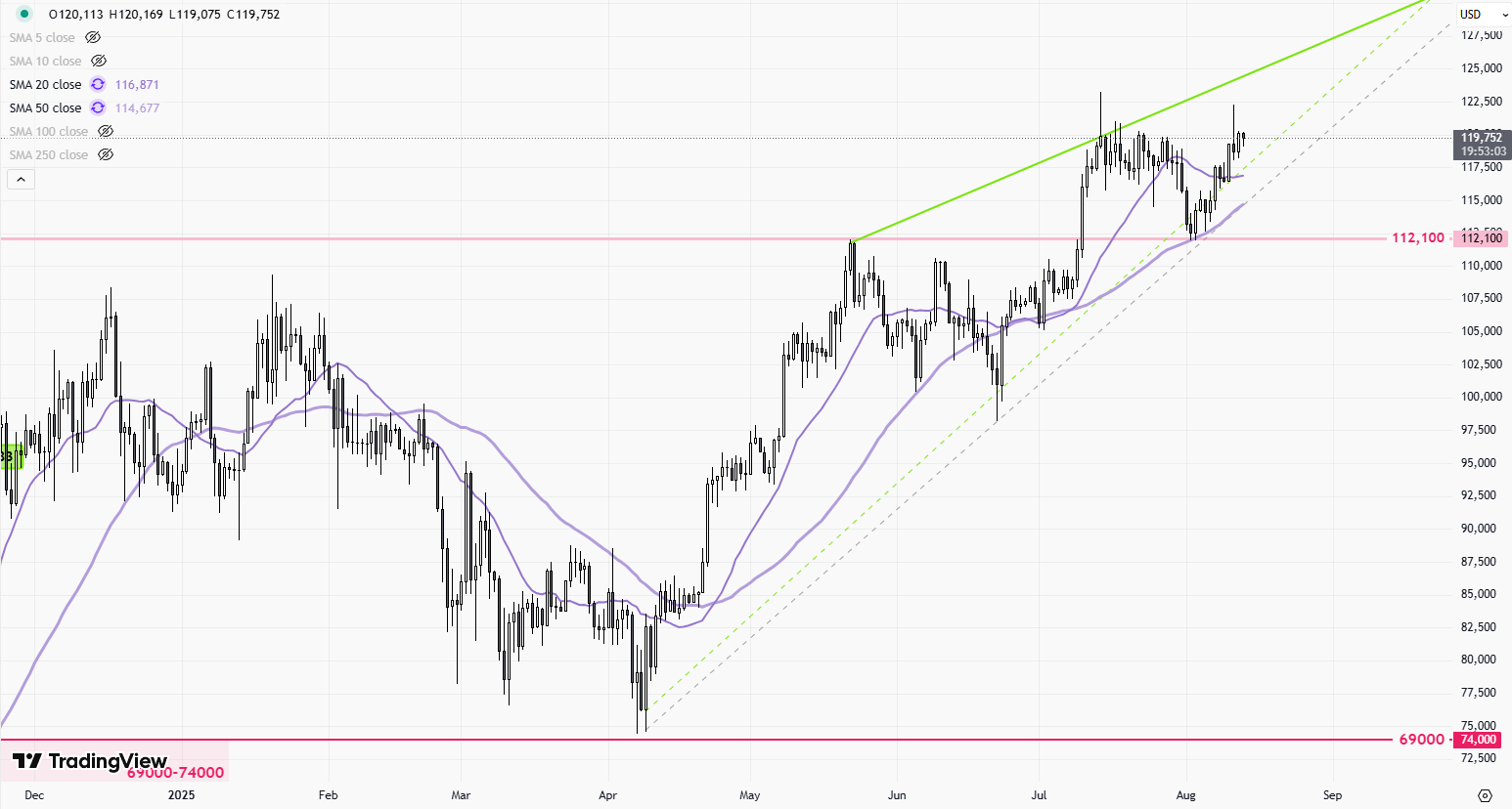 本週BTCUSD盤中維持在約118,850美元,過去七天累計小幅上漲約1.2%。在八月初突破114,000美元的歷史新高後,價格走勢趨於穩定,展現市場的審慎樂觀氛圍。近期走勢的主要推動力包括機構資金持續流入,特別是比特幣ETF的強勁投資流入,以及支撐風險資產的良好宏觀經濟情緒。此外,市場對監管明朗化的期待與比特幣主流採用度的不斷提升,也促使需求持續維持。儘管在歷史高點後出現部分獲利回吐以及對美國利率走向的敏感反應,短期波動加劇,整體市場情緒仍偏向多頭,由健全基本面和比特幣於傳統金融體系日益被接受所支撐。 BTCUSD 日線K線圖:技術分析 圖表上明顯的型態與指標 雙頂型態:圖中在歷史高位(約 123,200)出現了明顯的雙頂結構,頸線大致在 112,000。這是一個具代表性的空頭型態,一旦跌破頸線,趨勢反轉及下行風險將大幅提升。 射擊之星K線:在壓力區附近(小實體,長上影線)出現射擊之星,對多頭形成警訊,容易導致短線調整,尤其出現在高檔區時信號更強。 強大壓力區:122,000 至 123,200 一帶屢次阻止價格突破,形成了明顯的壓力帶。 支撐區:主要支撐位於 115,000,另有心理關口 112,000(同時為雙頂頸線位置)。 價格逼近歷史高位:比特幣近期維持在歷史高位窄幅震盪,這類盤整常預示重大突破或回檔即將出現。 圖表外觀察到的關鍵技術指標及可能發出的訊號 均線(如 50 日、100 日 EMA):目前價格仍高於 50 日與 100 日指數移動平均線,顯示中長期上升趨勢尚未被破壞,且近波段持續提供動態支撐。 RSI(相對強弱指標):雖然圖表未顯示,但高位盤整狀態下,RSI 可能處於或略高於 70,顯示超買,短線有調整壓力。 MACD:近期高位震盪且動能減弱,MACD 柱狀圖正值趨於收窄,有形成空頭交叉的潛在風險。 布林通道:接近歷史高位且盤整幅度收斂,布林通道極可能收窄,通常預告即將出現波動性急遽拉升。 成交量:近期成交量明顯萎縮,顯示市場動能不足。通常在量縮下的突破,成功率較低,容易失敗或出現假突破。 主要圖形型態與K線信號 雙頂型態:若頸線失守,代表中期回檔跡象明顯。 射擊之星:出現在技術性壓力,同時警告短線反轉風險升高。 多頭反轉信號缺席:目前並無明顯的多頭反轉K線,更加重多方的脆弱度,若支撐區失守,將加劇賣壓。 趨勢總評 大的多頭趨勢仍在:價格仍站穩關鍵均線與重要支撐之上,結構上尚屬多頭。 短線中性偏弱:雙頂及射擊之星在壓力區形成,提醒投資人謹慎。未能有效帶量突破歷史高點前,容易出現回測或修正。 突破或跌破臨近:價格與動能同步收斂,市場將迎來大幅波動。若突破 123,200,可望延續新一波漲勢;失守 112,000,則下修風險顯著升高。 重要支撐與壓力位 壓力區:122,000 – 123,200(歷史新高,心理與技術壓力) 短線支撐:118,000 – 115,000(近期低點與盤整密集區) 主要支撐(雙頂頸線):112,000 若突破,目標上看:125,000 若跌破,回測目標:108,000 或更低 其他關鍵技術觀察 […]