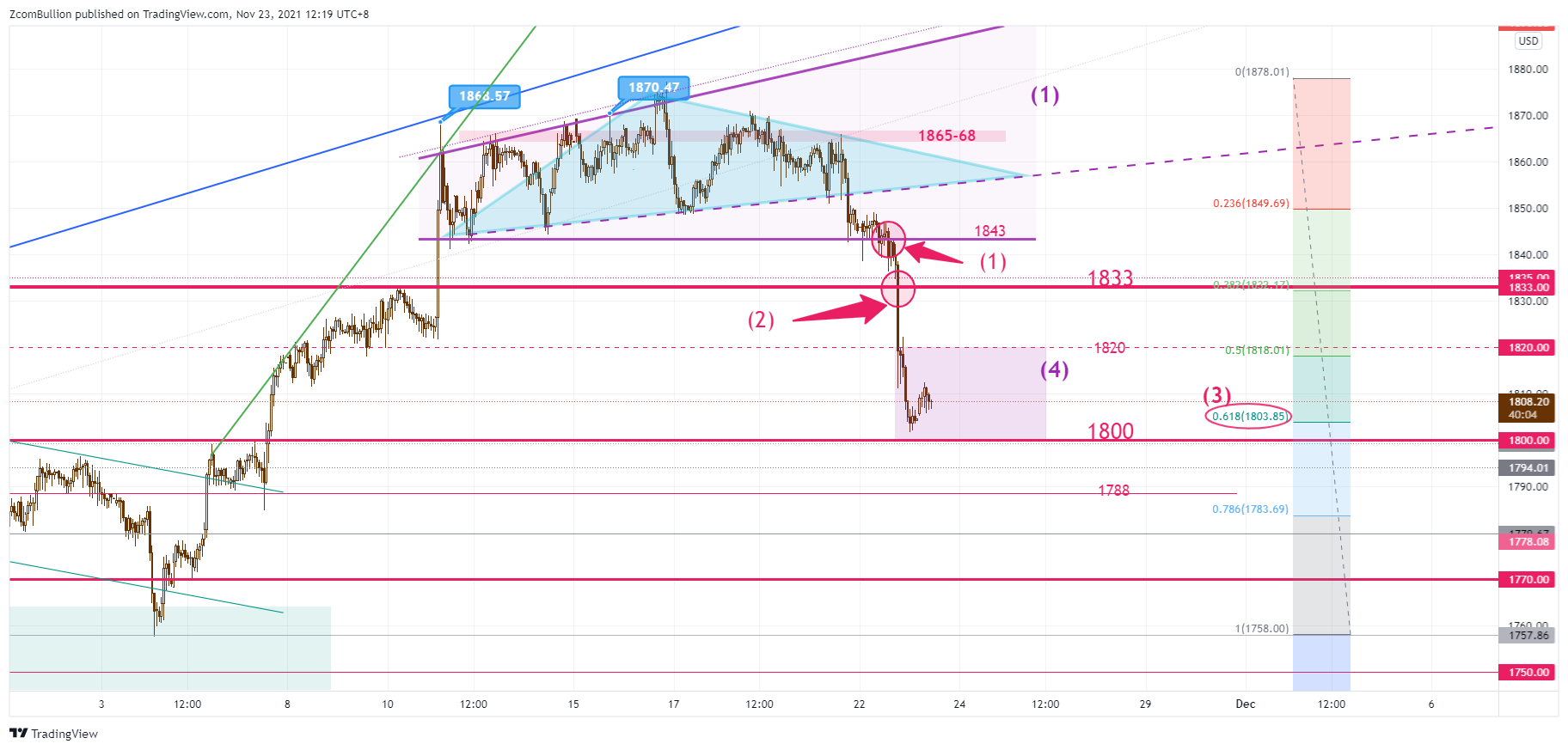 黃金昨日下跌超過40美元。早段低開在1841附近,成功突破1843(1)後輾轉往下,在美盤跌穿1833(2)後下跌加速,最低1802,收市在1804,全日下跌42美元。 黃金終於在昨日離開了楔形(1)區間,引發了一輪下跌,往下回調已到之前上升趨勢(1758至1878)的61.8%(3)。短線趨勢仍然向下,1小時圖在1800-03短線會有支持,但仍須等待明顯的見底訊號,反彈才會正式開始。突破前,日內區間1800-1820(4)。 黃金脫離區間(5)後,一直期待的調整正式開始。昨日下跌比預期更快更急,短暫趨勢支持在250正天移動平均線(6)。但必須留意,雖然今日開市高開,但日線圖仍未出現見底訊號,未來48小時若金價繼續往下,可以留意下方上升趨勢線(7)。 短線阻力:182518201810-12 現價: 1807 短線支持:1803-0017951790