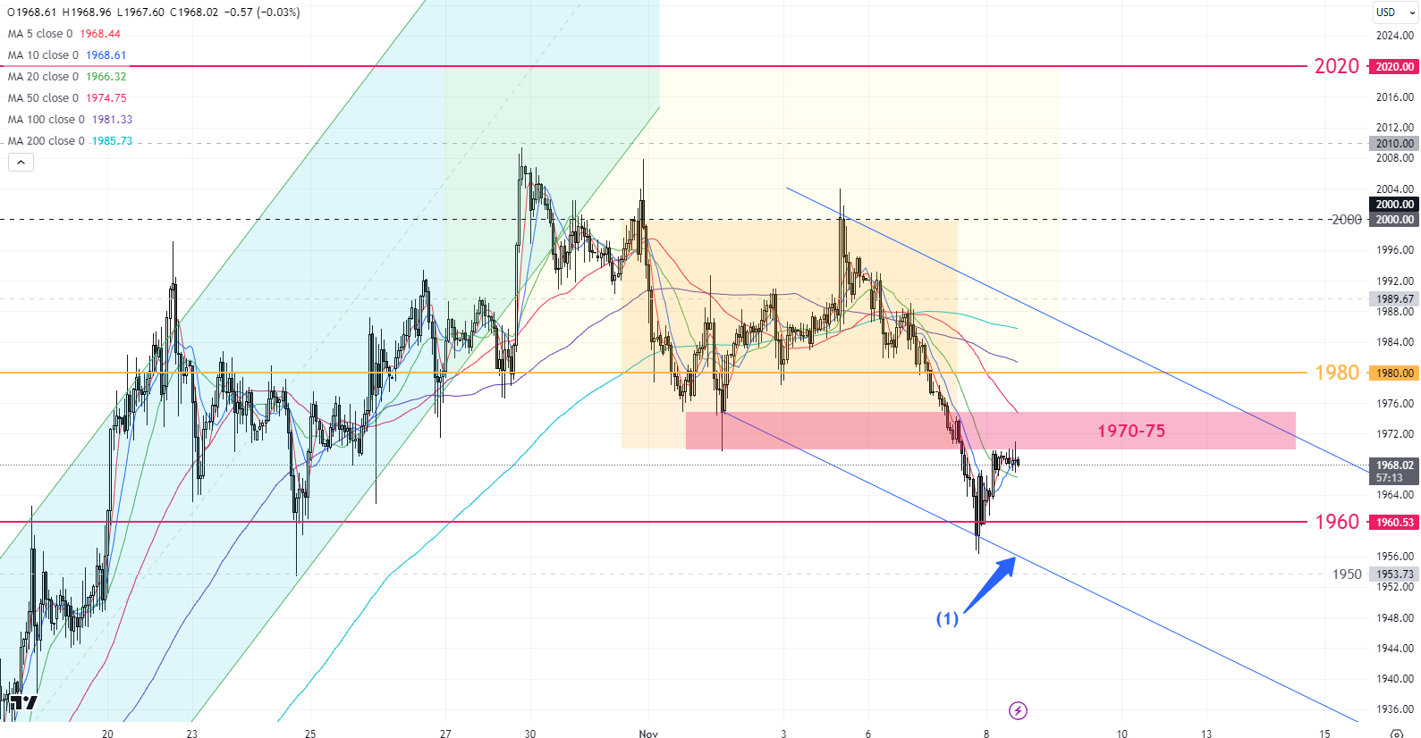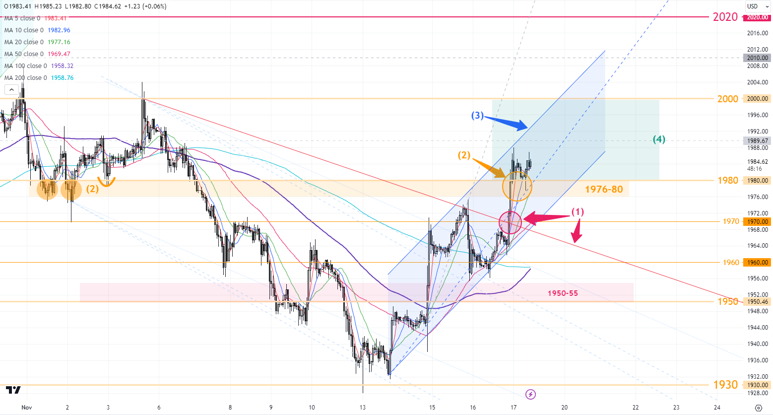 黃金昨日清除20天移動均線及1980阻力,升勢重開。早段亞盤價格先從低位反彈,回到1960以上,美盤前維持在1961-67之間上落。美盤開市,美國就業數據(初申請失業救濟人數)比預期更差,美匯/債息再次受壓,金價先升穿下降阻力(1)。隨後再借美國工業及制造業數據繼續往上,清除1976-80區間阻力(2),全日收市在1981,上升21美元,暫時企穩在1980之上。 1小時圖 – 金價升穿短線阻力線(1)後,升勢重開。新的上升通道(3)在過去24小時剛形成,日內操作區間在1980-2000(4)。 日線圖 – 金價昨日突破一直在關注的20天移動均線(7),早前提及的轉勢訊號(5)完全被打破,觸及上損,而整體結構正在重組。價格升到1980以上後,趨勢已轉為向上,上方繼續留意下降阻力線(6)。 短線阻力 3 2000 短線阻力 2 1995 短線阻力 1 1988-90 現價 1985 短線支持 1 1980 短線支持 2 1973-75 短線阻力 3 1970 P. To 風險提示: 場外式黃金/白銀交易涉及高度風險,未必適合所有投資者。高度的槓桿可為閣下帶來負面或正面的影響。閣下在決定買賣場外式黃金/白銀之前應審慎考慮自己的投資目標、交易經驗以及風險接受程度。可能出現的情況包括蒙受部分或全部初始投資額的損失,或在極端情況下(例如相關市場跳空)產生更多的損失。因此,閣下不應將無法承受損失的資金用於投資。投資應知悉買賣場外式黃金/白銀有關的一切風險,如有需要,請向獨立財務顧問尋求意見。市場資料僅供參考,MAX Online 絕不保証分析內容的準確性。