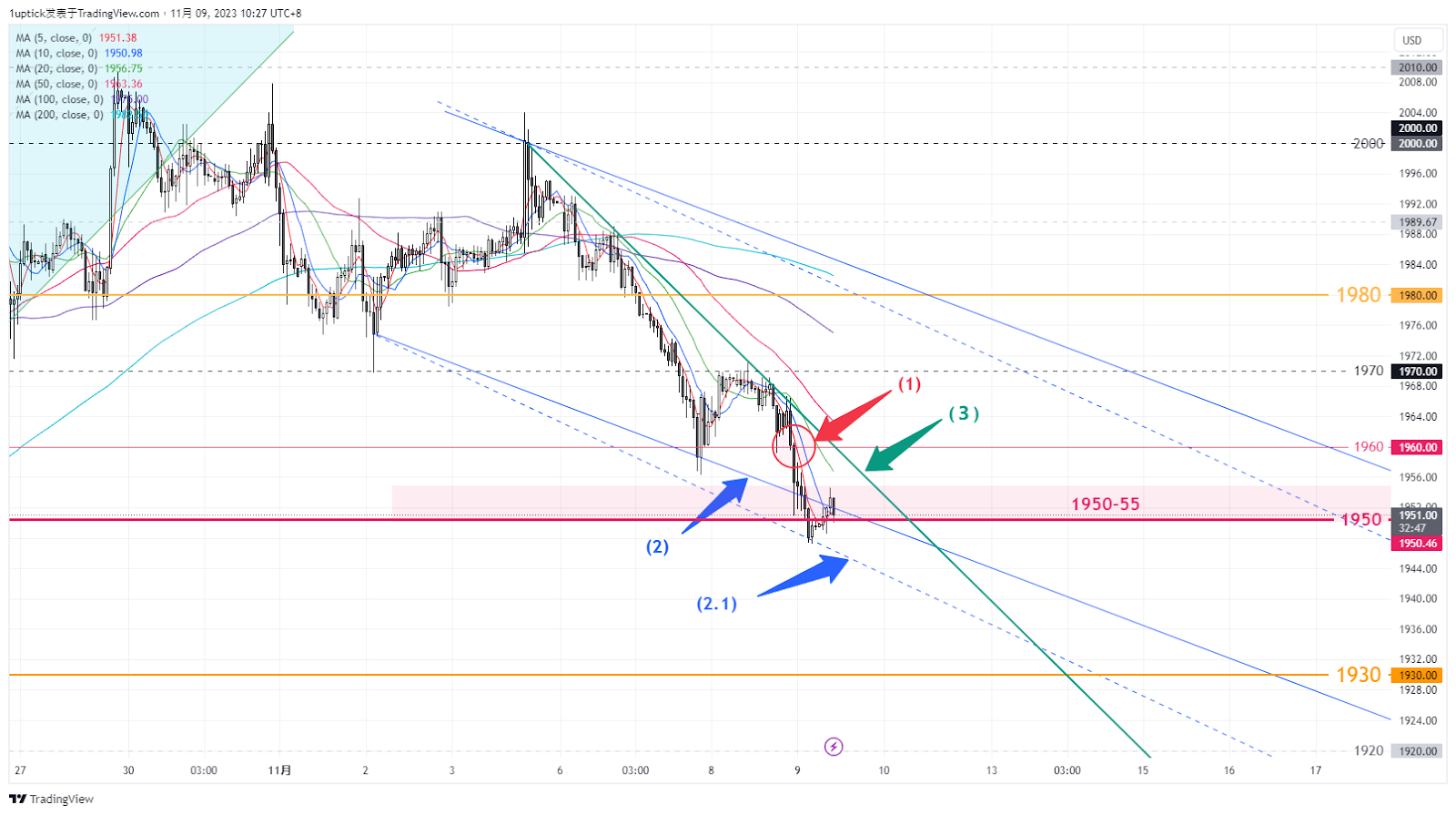 黃金週末前造出一週新低,順利在48小時完成了對上一篇分析的下跌循環。週四早段先升穿早前提及的下降阻力線(1),觸發出一輪短線買盤,反彈到1965附近。隨後下跌正式開始,週五美盤前已跌穿1950支持,美盤一直回落到全週新低1935,一週收市在1938,下跌53美元。 1小時圖 – 下降趨勢仍有加快跡象,早前的下降通道需再次調整,由(2.1)修正到(2.2)。經過今早亞盤開市快閃1928後,短線趨勢暫時以買盤主導,本週早段初步操作區間在1930-55(3)。 日線圖 – 黃金初步已完成由2004開始之調整,暫時支持在50天移動均線(4)。日線圖操作區間在1930-2003(5)。關鍵轉折點會出現在週二美市公佈的美國通脹數據。 短線阻力 3 1950-55 短線阻力 2 1945 短線阻力 1 1940 現價 1939 短線支持 1 1930-32 短線支持 2 1927 短線阻力 3 1920 P. To 風險提示: 場外式黃金/白銀交易涉及高度風險,未必適合所有投資者。高度的槓桿可為閣下帶來負面或正面的影響。閣下在決定買賣場外式黃金/白銀之前應審慎考慮自己的投資目標、交易經驗以及風險接受程度。可能出現的情況包括蒙受部分或全部初始投資額的損失,或在極端情況下(例如相關市場跳空)產生更多的損失。因此,閣下不應將無法承受損失的資金用於投資。投資應知悉買賣場外式黃金/白銀有關的一切風險,如有需要,請向獨立財務顧問尋求意見。市場資料僅供參考,MAX Online 絕不保証分析內容的準確性。